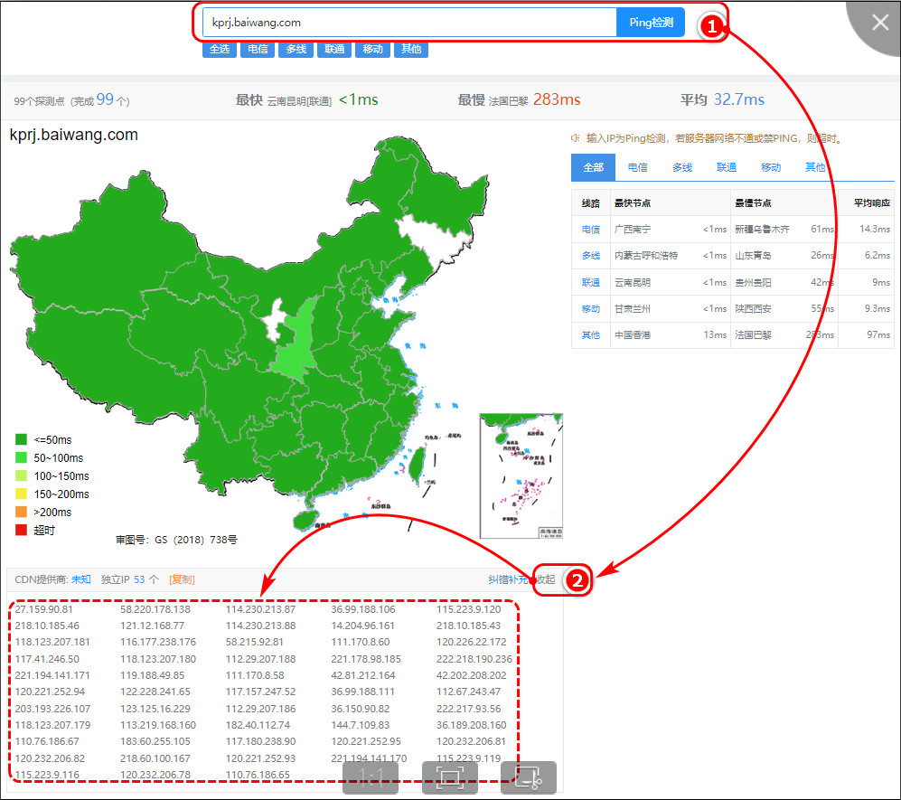 1、打开出现白板的电脑浏览器,地址输入:https://ping.chinaz.com/kprj.baiwang.com,在ping那里填写地域名kprj.baiwang.com,点ping检测,下方点更多出现一堆IP地址。