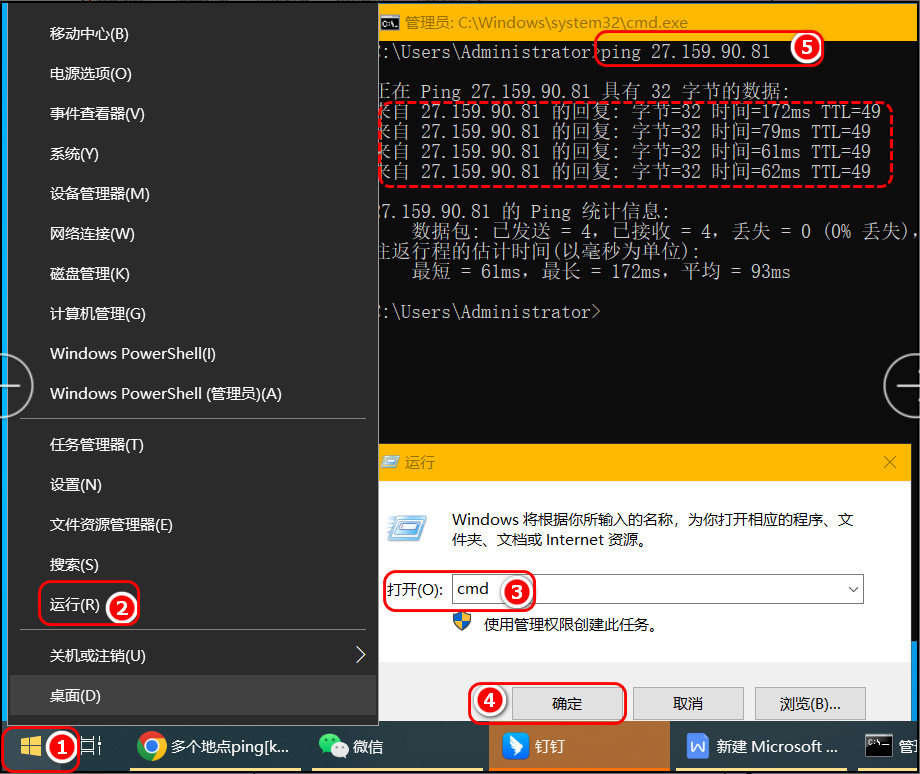 2、再打开白板的电脑的DOS界面(【开始】-鼠标右健【运行】-输入cmd回车),输入ping 上面网页中的随便一个IP,看是否能ping通,ping通表示这IP正常。