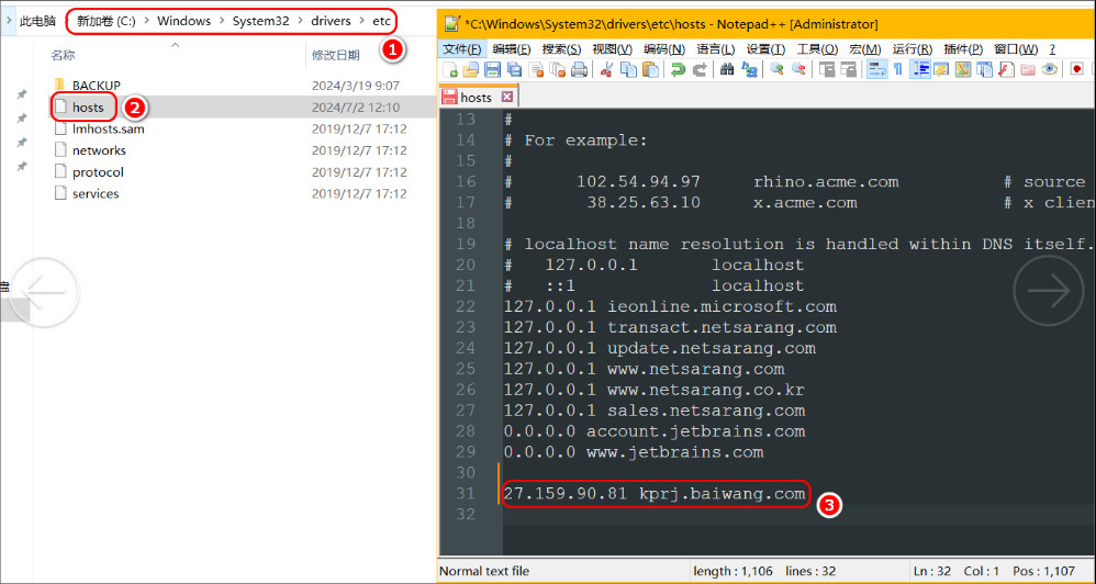 3、打开C:\Windows\System32\drivers\etc,使用记事本编辑此文件,把第2步中能ping通的IP空格域名放到文件的最后(文件中原有的内容不要动),保存再重新打开开票软件测试。