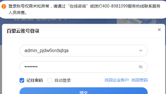 登陆时提示:登录账号权限未知异常,请通过“在线咨询”或拨打400-8981099服务热线联系服务人员排查。方法:原因是此税号在百望云被冻结了,需要走钉钉找2.0或1.0群中解冻或市场部汇总统一上报解冻。