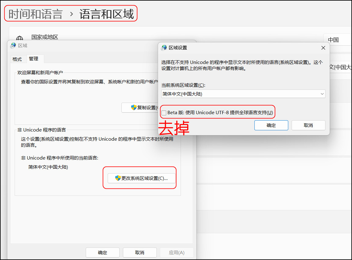 1、进入本机的控制面版-时间和语言-语言区域-管理语言设置-管理-更改系统区域设置:去掉勾选图中位置